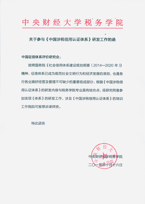 中央财经大学税务学院关于参与《中国涉税信用认证体系》研发工作的函